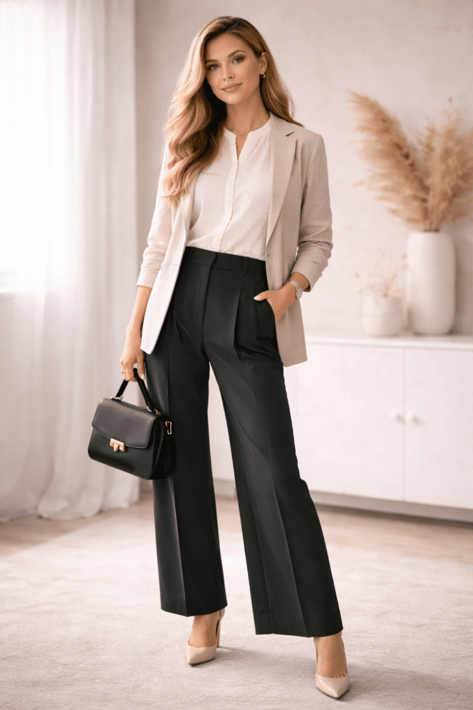 A structured blazer paired with tailored trousers creates a timeless office look. This combination instantly looks professional and works perfectly for meetings or important workdays.